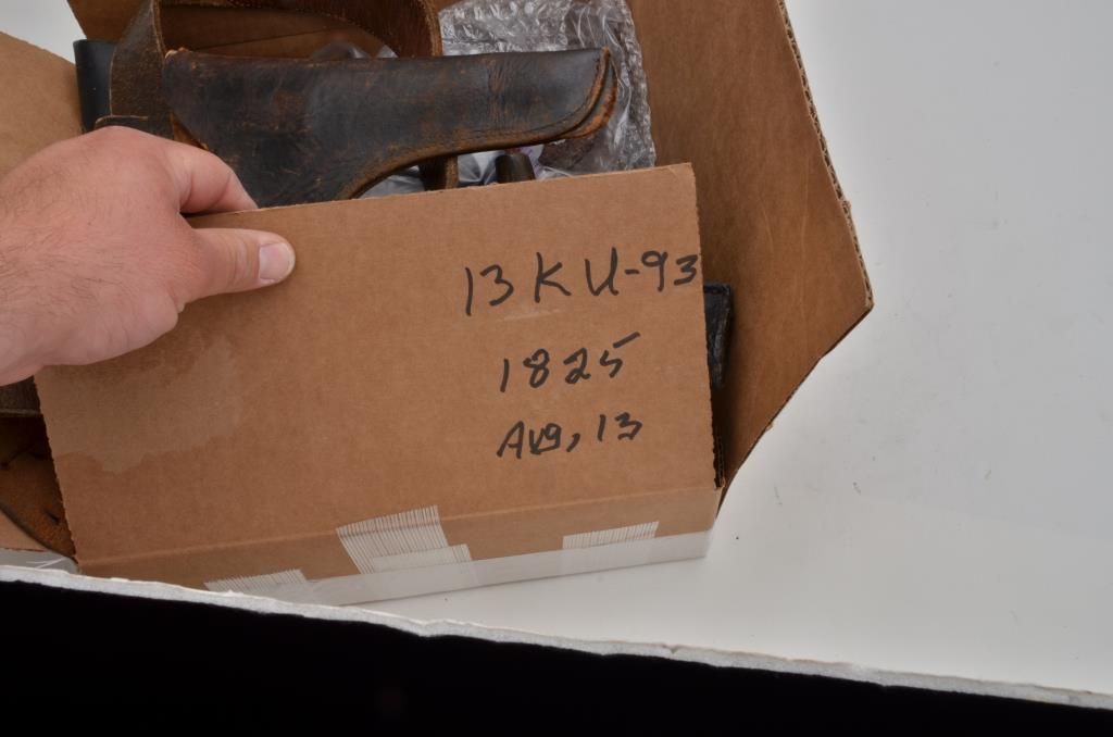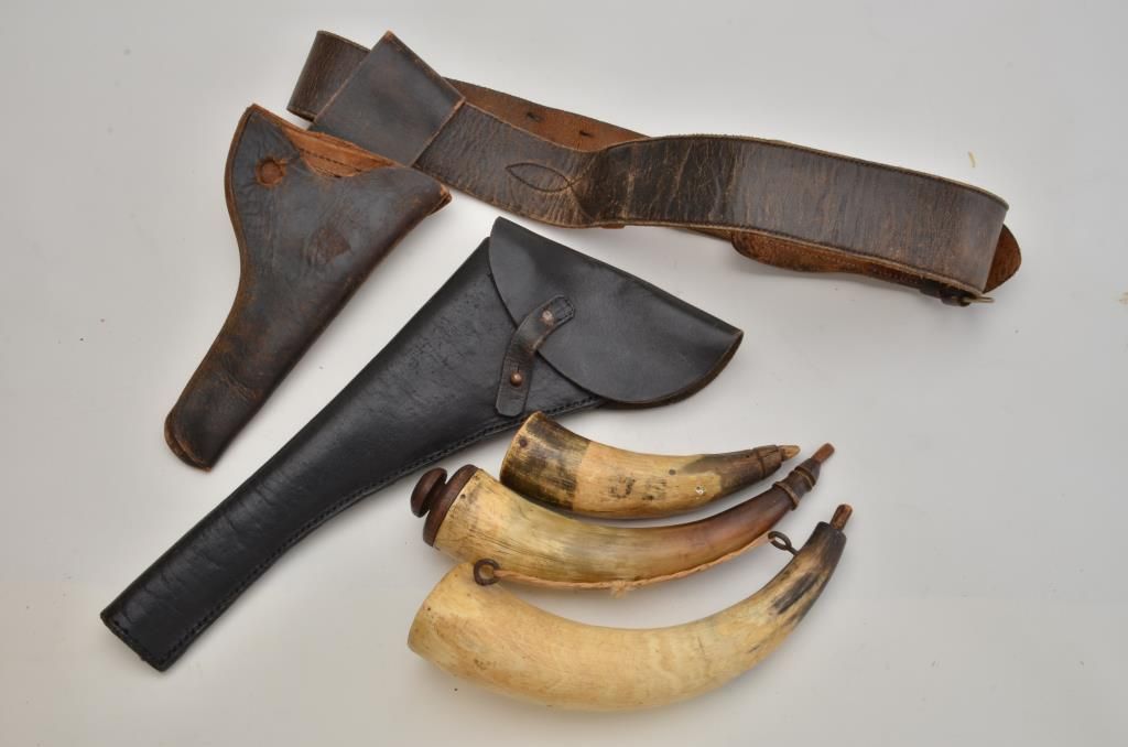 Great collectible bonanza lot including a large fossil clam shell; two volumes of London’s hardback Sporting Magazine dated 1797 and 1815; 4 powder horns, two leather holster, one with a belt; part of a cannonshell and small lot of misc. antique reloading items, patch cutter, balls, patch cutting knife, etc. Est.: $125-$175.