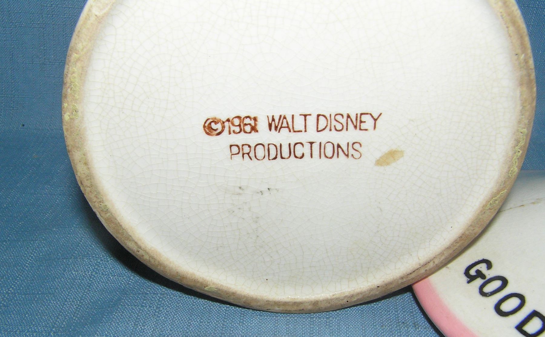 Great early Lollipop container all porcelian featuring Mickey Mouse, Dondald Duck and Ludwig Von Drake marked and dated Walt Disney Productions 1961 this piece is in good condition considering its age with a hair line crack through Donald Duck and a cracked and repaired top est. value 150.00-175.00