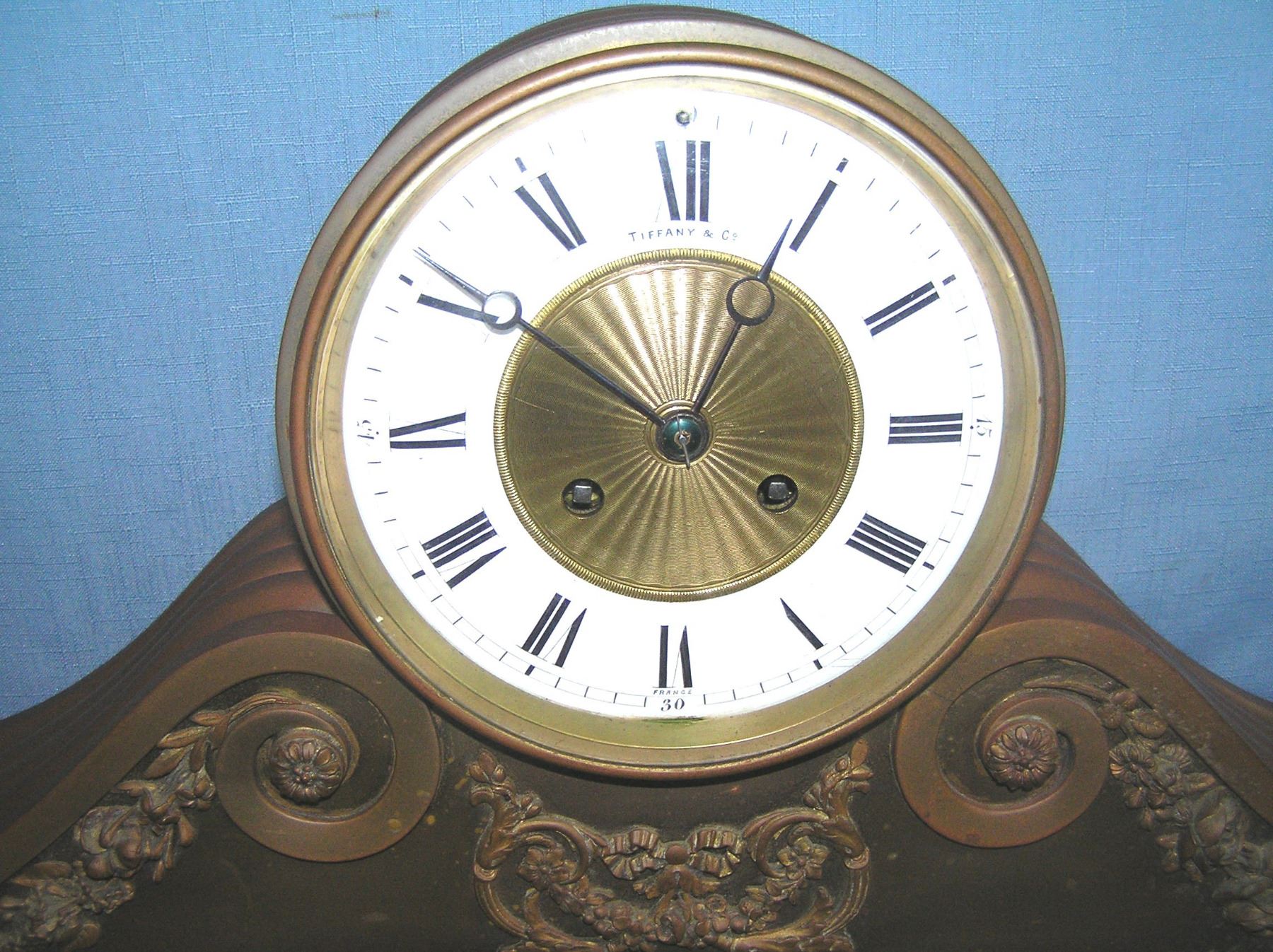 Great early Tiffany and Co. bronze mantle clock decorated with floral and leaf motif with applied bronze feet, clock works, porcelain face made in France, this great high end Tiffany and company piece was recently removed from a New Jersey estate est. value $6000-$7000