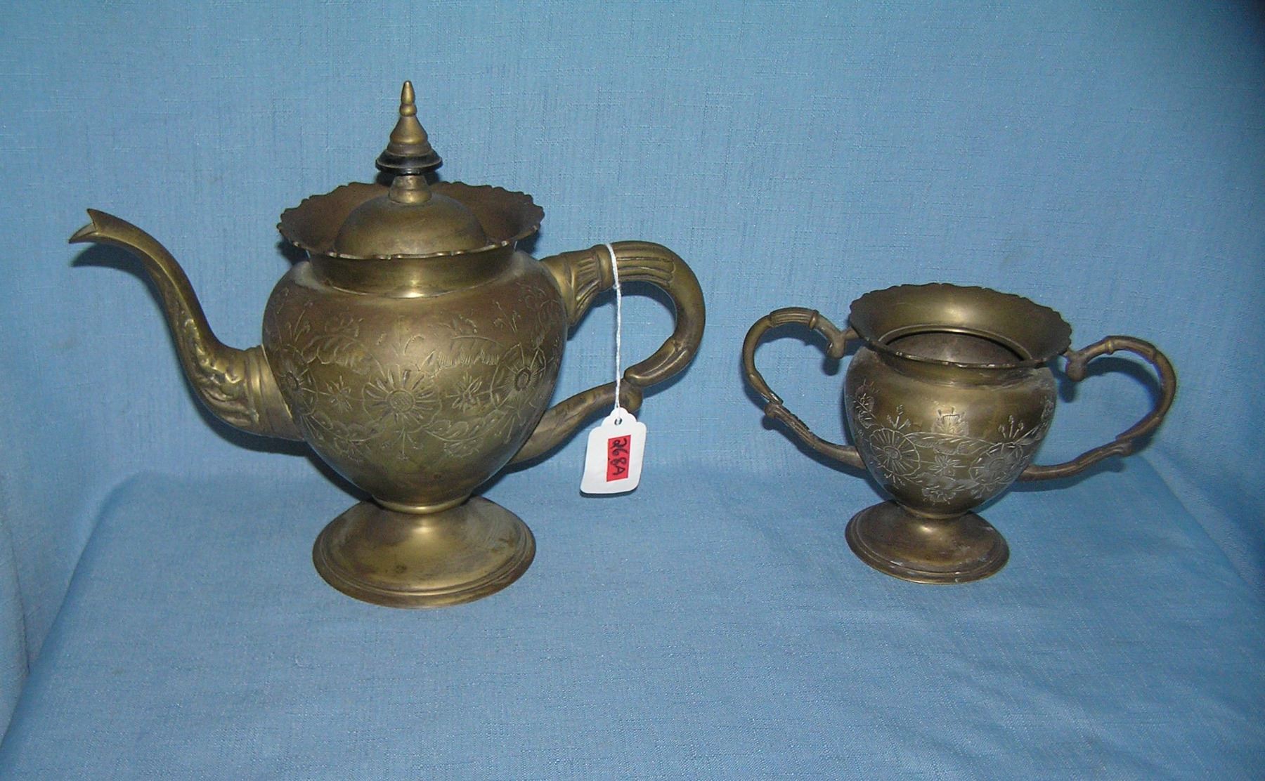 Great early brass over silver plate coffee pot and 2 handled sugar bowl wonderful hand cut design throughout both pieces, coffee pot hall marked on base 556 India circa early 1900's est. value 175.00-200.00