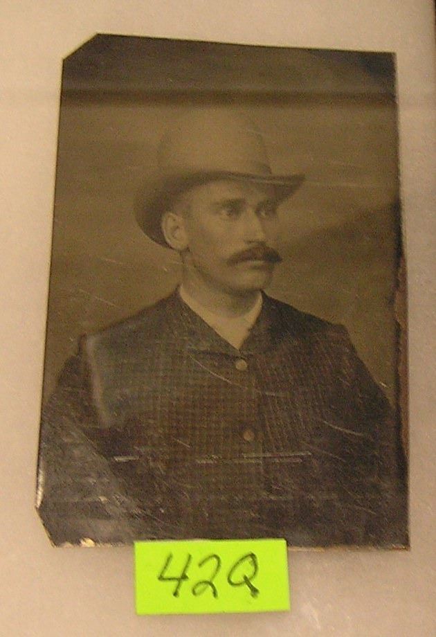 Great early tin type photograph of a man with bowler hat, striped suit and mustache est. value $75.00-$100.00
