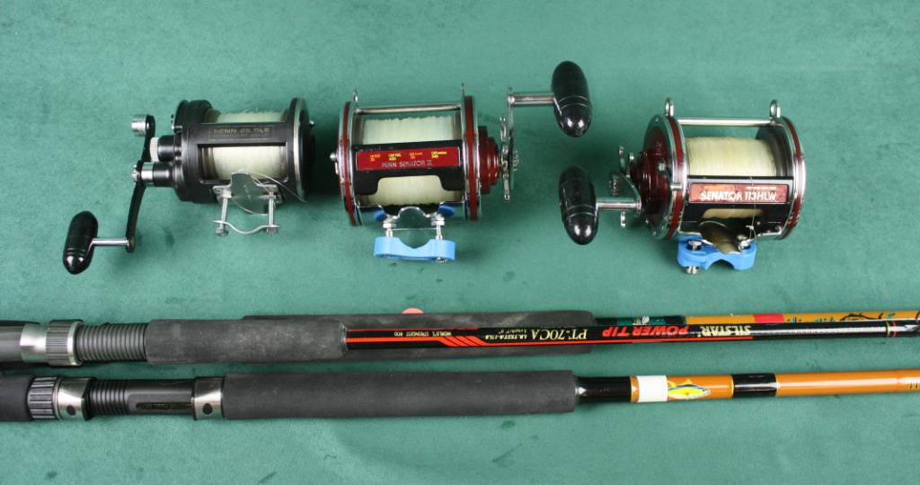 Great fishing lot including Penn Senator II reel, a Penn Special 4/0 Senator Model 113H reel and a Penn Model 25 GLS reel, all in very good condition; accompanied by reel guard bags and an assortment of new unwrapped spools of line in varying lengths and strengths. Also included are three fishing rods in fine condition; a Roddy Gator Tail, a Fenwick Supreme and Silstar Powertip. Est.: $250-$350.