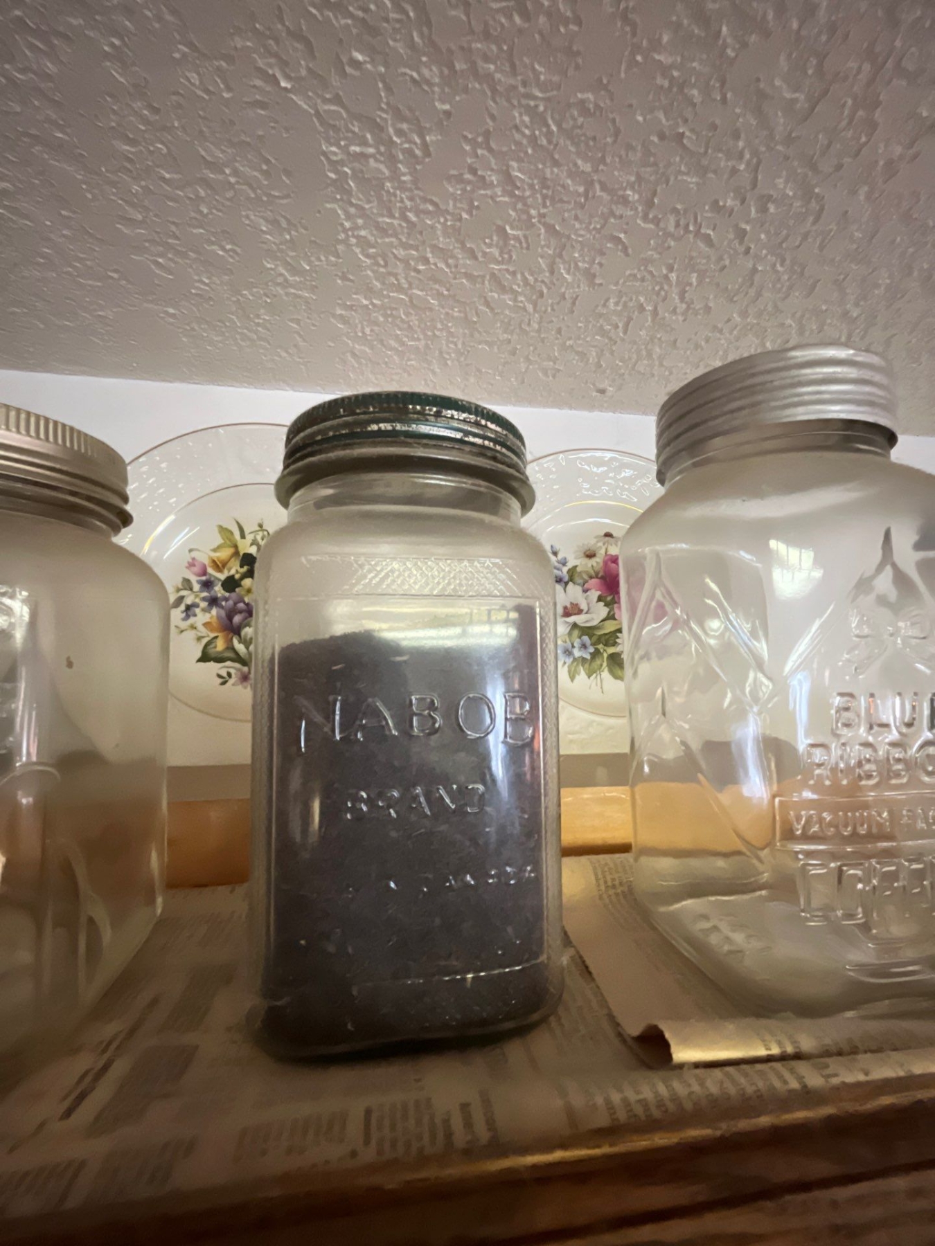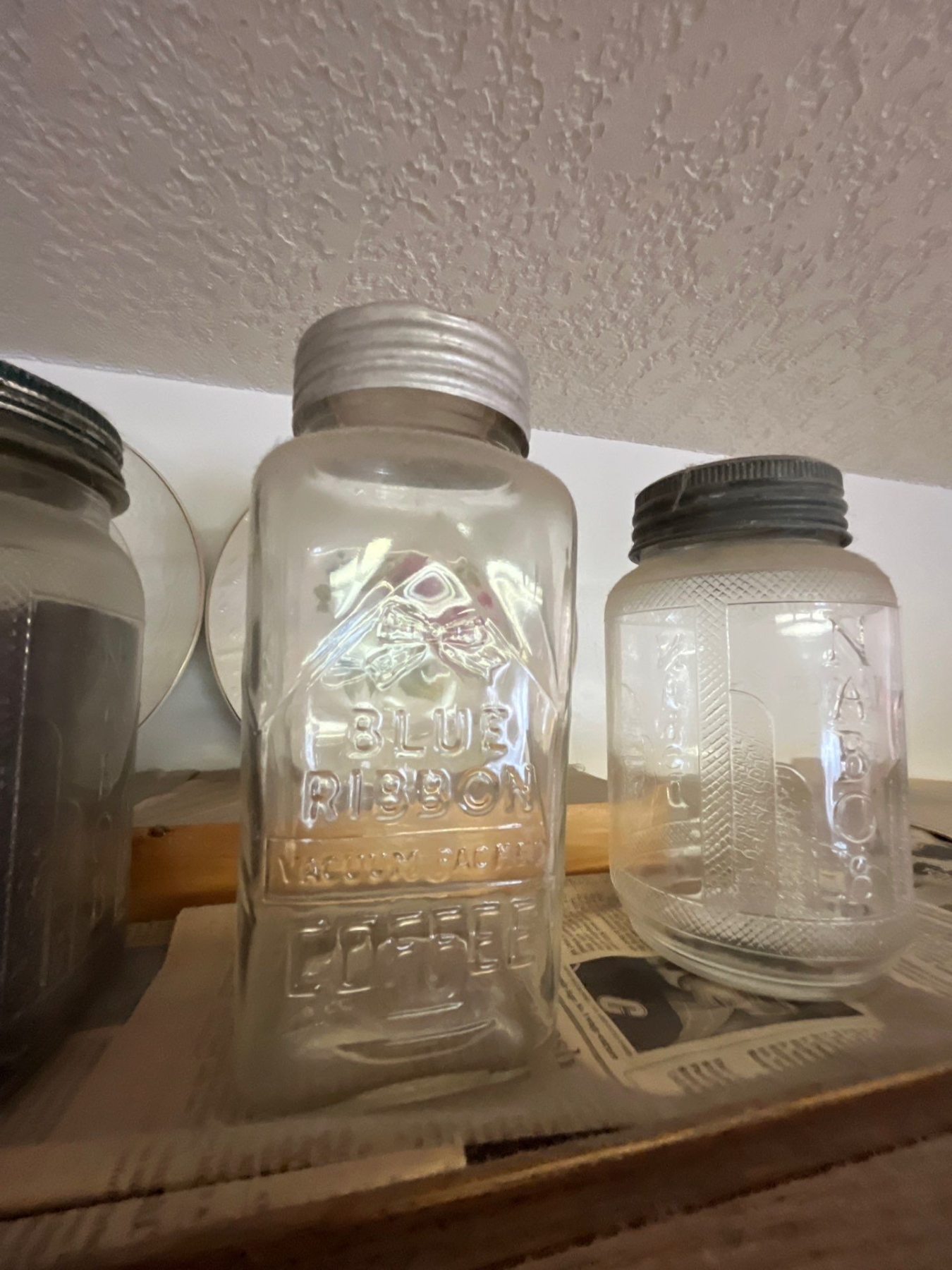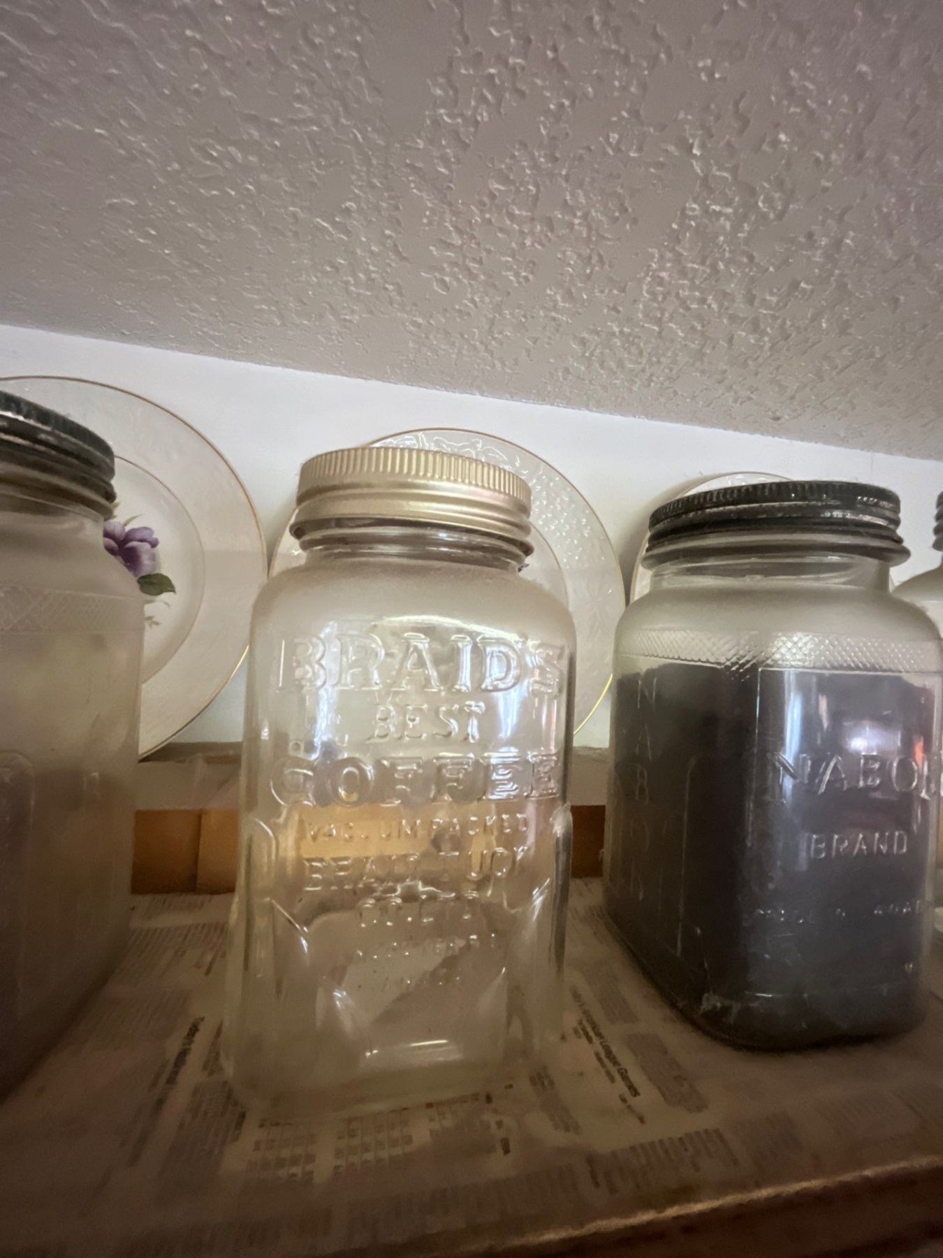 Great group of vintage coffee storage glass canisters from 3 NABOB blue ribbon, coffee and Braids best coffee with three collector plates