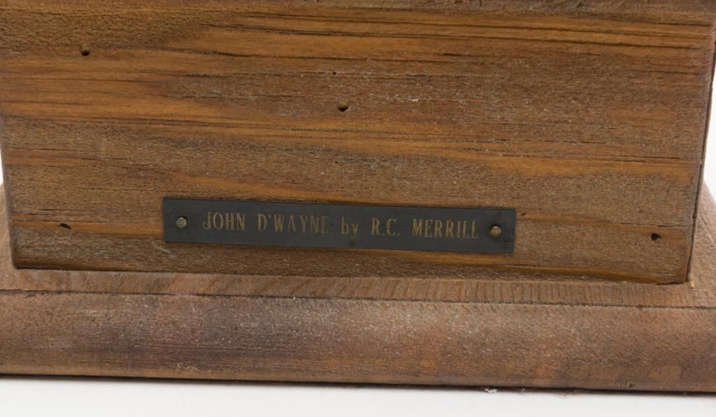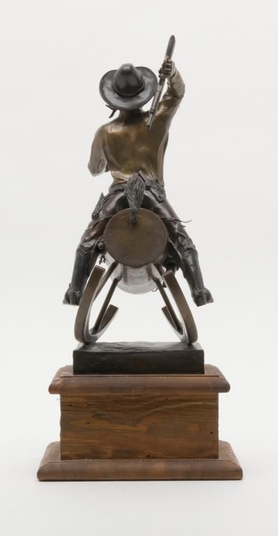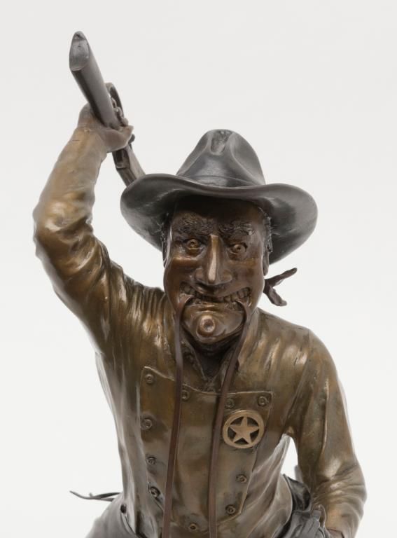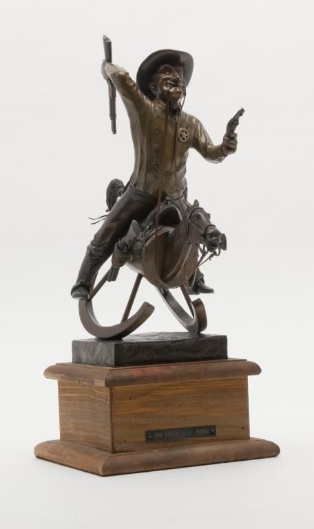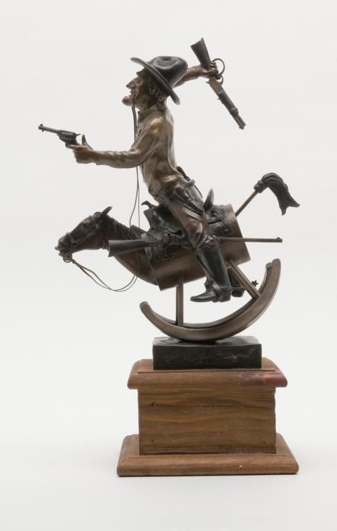 Great humorous motif limited edition (11/30)bronze entitled “John D’ Wayne” (1993) by R.C. Merrill, artist and Illustrator for S.A.S.S. events, showing a heavily armed lawman on a rocking horse (lawman a la Rooster Cogburn) headed into battle,on wood base, approx. 20” in height. Est.: $500-$1,000.