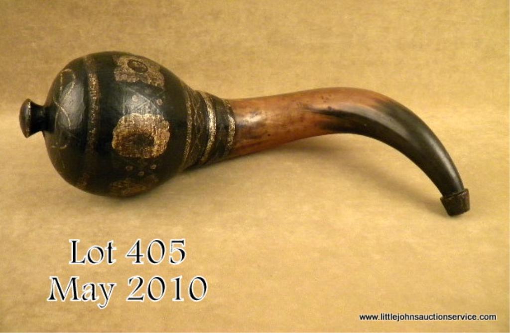 Great large old Moroccan storage horn for powder, approx. 16” overall with a leather covered and decorated ball receptacle attached to the horn in overall good condition; the decoration is of geometric designs done in a silver appliqué thathas darkened with age; the horn’s body is un-adorned. From the Estate of C.W. Slagle. Est.: $250-$500.