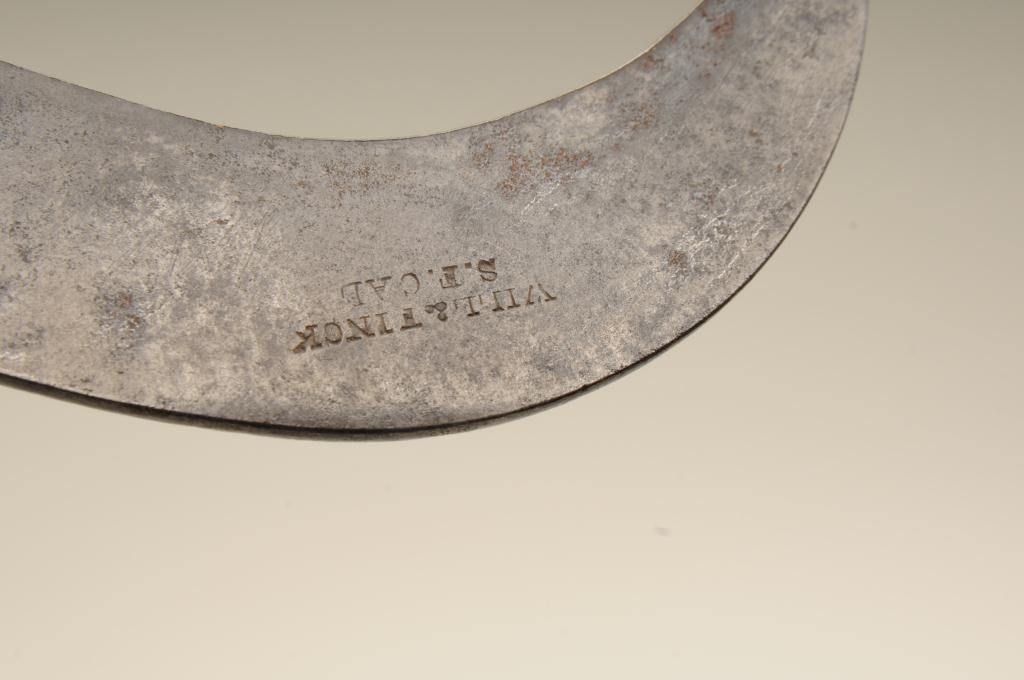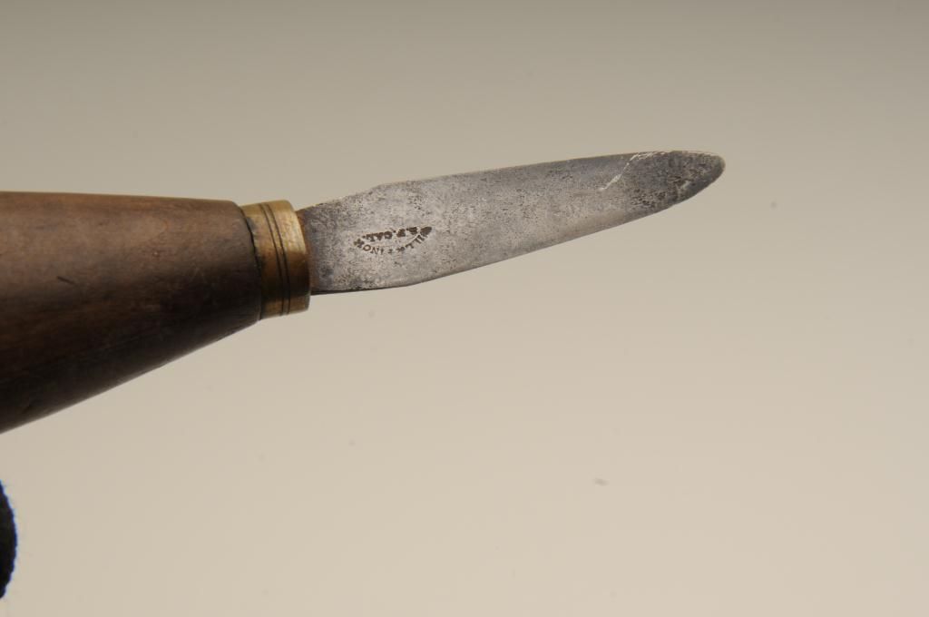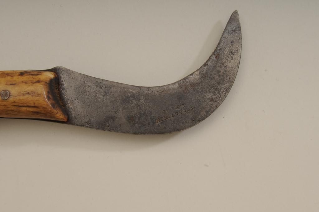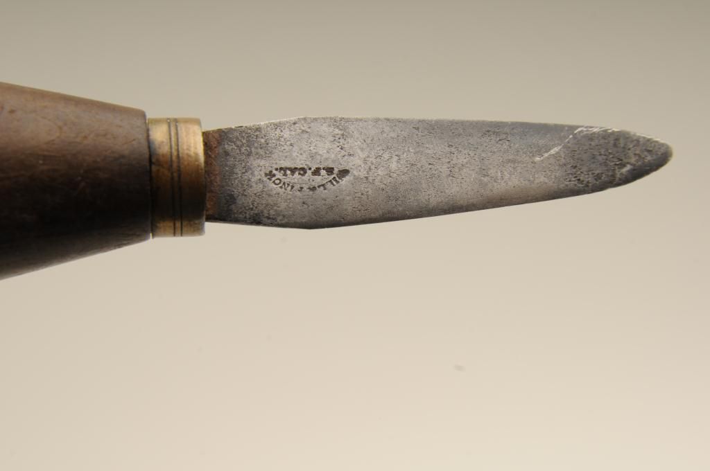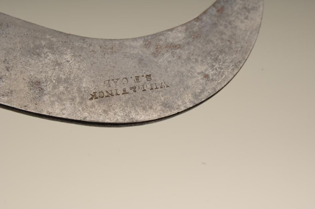 Great little lot of 2 authentic Will & Finck, S.F. Cal-marked items including a curved blade skinning knife approx. 9” overall with a 4” blade and well-worn two-pin stag grip and a small blade with wood “bulb” gripapprox. 5” overall with a 2” spear-type blade in overall good condition. Est.: $400-$800.