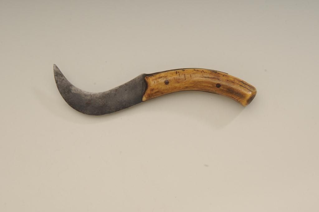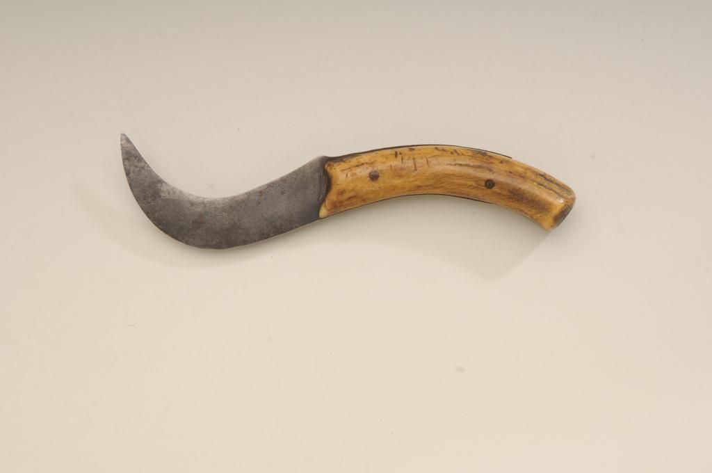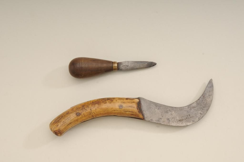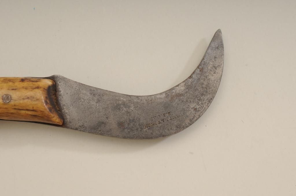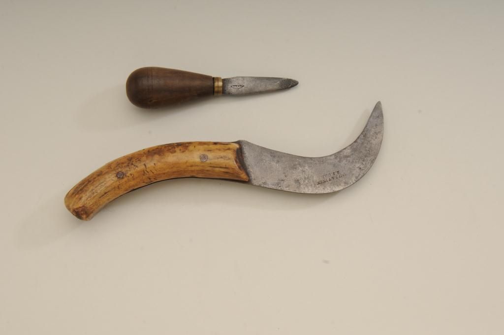 Great little lot of 2 authentic Will & Finck, S.F. Cal-marked items including a curved blade skinning knife approx. 9” overall with a 4” blade and well-worn two-pin stag grip and a small blade with wood “bulb” gripapprox. 5” overall with a 2” spear-type blade in overall good condition. Est.: $400-$800.