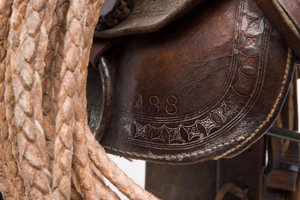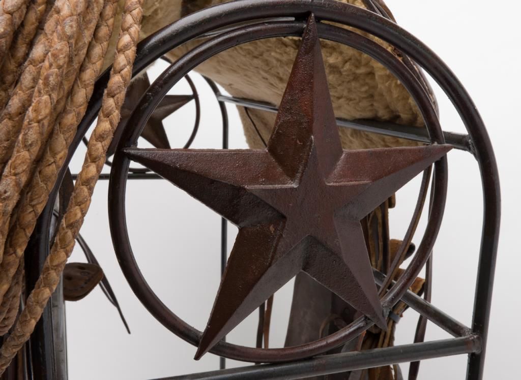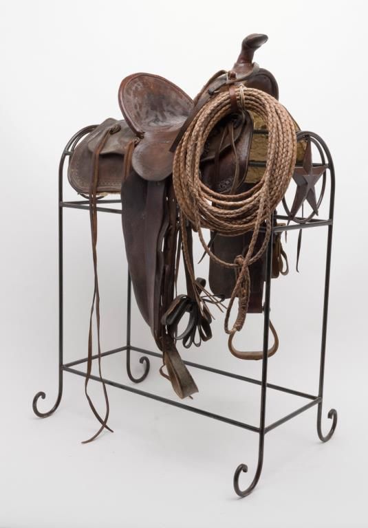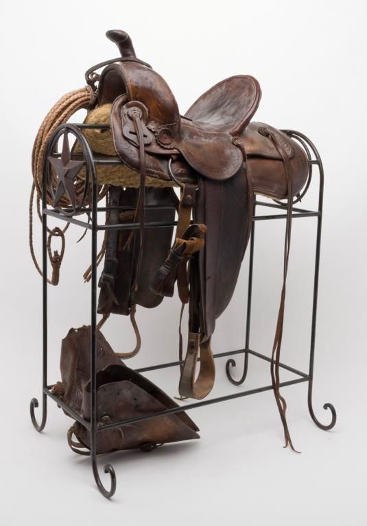Great looking Western tooled leather stock high back saddle on iron stand prominently displaying Texas stars at both ends, in overall well-used but good condition including large leather tapaderos and a braided reata. Est.: $350-$700.