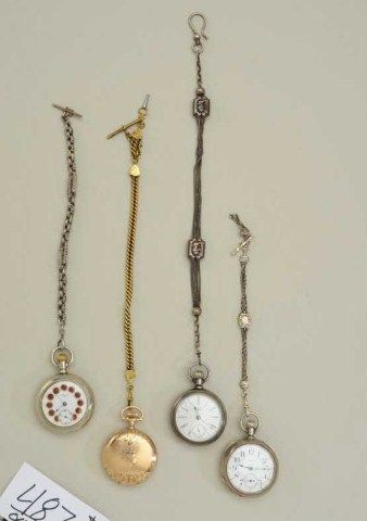 Great lot of 4 antique pocket watches with chains including a Waltham open face coin silver case with engraved back cover; intricate watch chain (not running); an American Waltham Co. open face screw backcase with gold inlaid elk on back removable mechanism cover (running at time of description) with beautiful slide watch chain; a Republic Watch Co. open face “silverode” case (not running) with fancymulti-colored enamel face and fancy watch chain, and a fancy gold filled key wind E. Howard and Co. case watch inscribed “W.R. Guthrie” on the inner mechanism cover (not running) with fancy engraving on outside ofcase and a watch chain with key; all very nice examples of early timepieces that were cherished by their owners; before the advent of the wristwatch and cell phone. Est.: $250-$500.