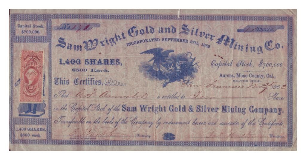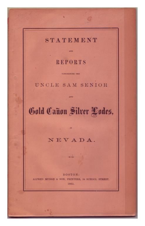 Great lot of Old West Mining legal documents including a stock certificate for 10 shares for the California Mining Co. ((1873-1879); a stock certificate for 100 shares for the Consolidated Virginia Mining Co. (1879); a stock certificatefor 100 shares of the Hale and Norcross Silver Mining Co. (1893); a stock certificate for 500 shares for the Goodman Gold and Silver Mining Co., Virginia City, NV. (1874); a stock certificate for the York Mining Co., NV. (1852); a stockcertificate for 1400 shares for the Sam Wright Gold and Silver Mining Co., Mono County, CA. (1868); a booklet entitled “Statement and Reports Concerning Uncle Sam Senior and Gold Canon Silver Lodes in Nevada”, dated 1865 (26 pages) and aCertificate of Location for a mining claim named Katherine M., located by W. Milligan, Tonopah, NV., 1925. Est.: $125-$175.