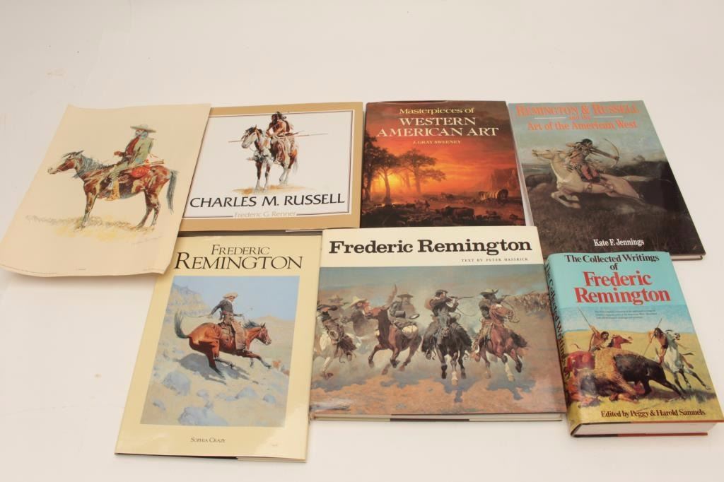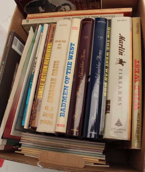 Great lot of approximately 30 mostly hardback reference books on guns, the West, gunfighters, Western Artist Frederic Remington, misc. subjects plus several original early-to-mid 1800’s newspapers andmisc. magazines; includes Brophy’s reference book “Marlin Firearms”. Est.: $50-$100.