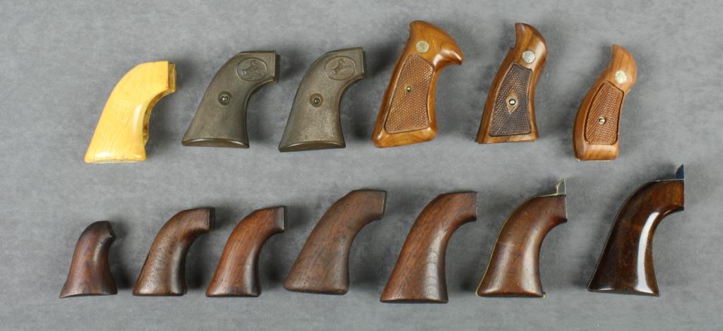 Great lot of old revolver grips including two  Colt 1860 Army grips, a pair of 1851 Navy  grips, a beautiful old pair of ivories for a  Colt 1851 Navy, two pair of rampant Colt SAA  hard rubber grips, two Colt Pocket modelpairs of grips, a pair of Colt Root grips,  and several misc. S&W grips.  Est.:   $400-$600.