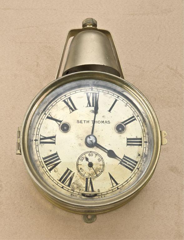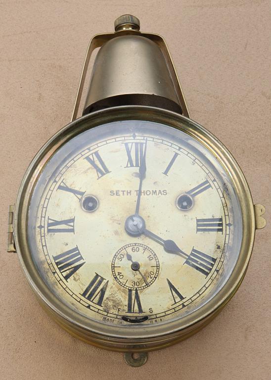 Great old circular brass ship’s clock with alarm bell on the top by Seth Thomas, approx. 6” in diameter in overall excellent exterior condition with original paper advertiser on the back that is approx. 90% complete; hour,minute and separate second hands, no key, unknown operating condition. Est.: $350-$700.