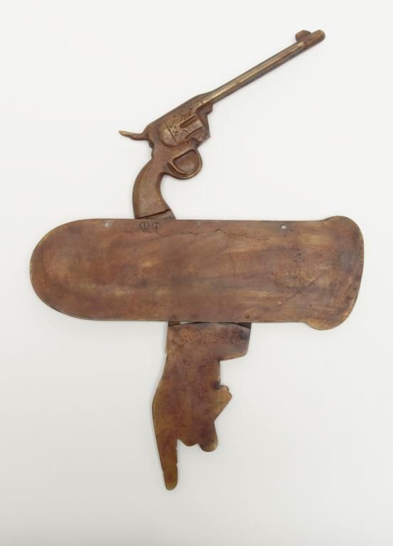 Great old large cast brass advertising sign, likely for a gun shop displaying a classic Colt SAA revolver over a cartridge with the “COLT” logo and the pointing hand “SOLD HERE”; approx. 24” in height and 16” wide, it would make a wonderfuldisplay piece in any gunroom, collector’s library, office or gunshop. Est.: $1,000-$2,000.