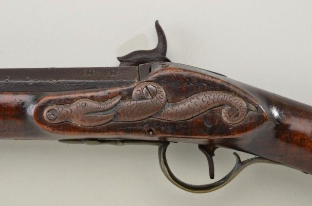 Great old percussion full stock trade gun with serpentine reverse side lock plate, .69 cal., 47” round barrel, tiger striped wood stock, brass tipped wood ramrod. This gun is in overall very good condition showing a dark patina on metal surfaces with scattered erosion and old pitting at firing areas, brass acorn style engraved trigger guard, two brass ramrod ferrules, brass butt plate; good action; wood shows beautiful patina andgraining with some old expertly accomplished repairs to cracks along barrel areas; old dings and mars on butt stock and an undecipherable marking; brass or copper serpentine on left side of stock is very good with heavy dark patina; a beautiful trade gun that has a classic appearance. Est.: $1,750-$3,500.