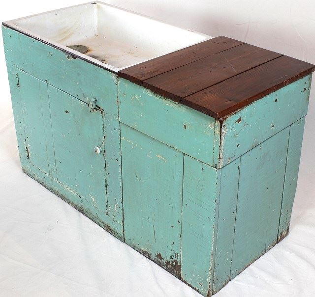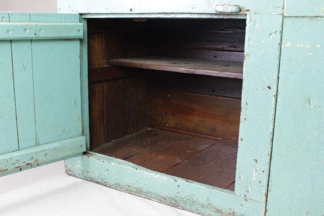with old teal blue paint, single door, enamel sink compartment stenciled W.H. Leacock Dewitt, Nebr. Nebr., 20” X 47 1/2” X 30” tall. Est. 450-900