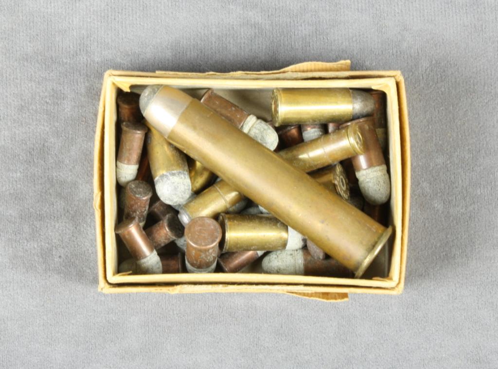 Great small lot of antique ammo including  approx. a dozen and a half rimfire small  caliber rounds, several .45 Webley rounds, a  couple .38 Special, one .44 S&W Russian round  and the star of this small lot, a desirable.600 Nitro Kynoch round.  Est.:  $50-$100.