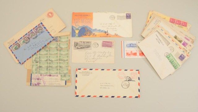 Great starter U.S. stamp collection including over 50 envelopes from all over the country, some international, with early stamps and business artwork and misc. loose stamps including air mail, etc. Est.: $25-$50.