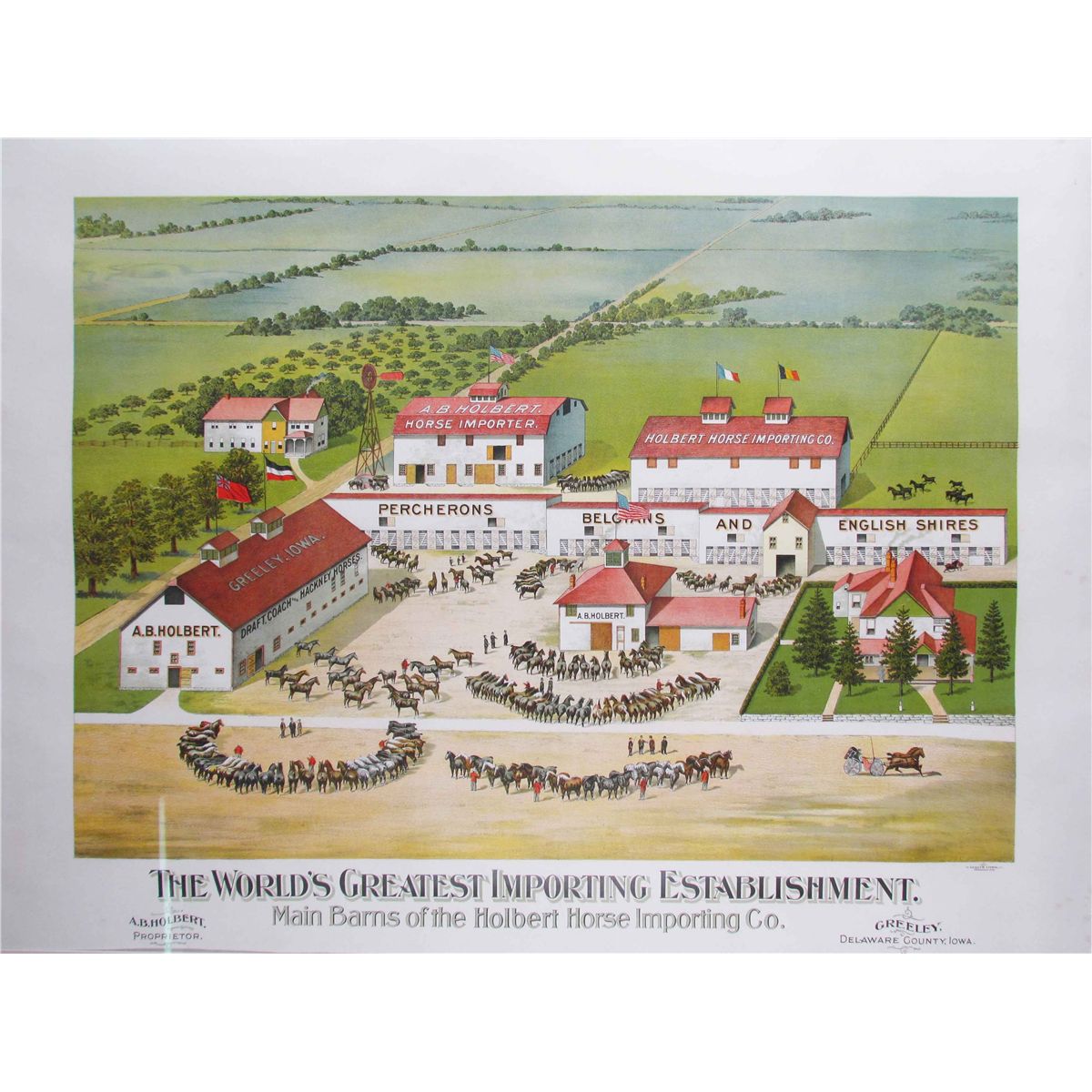 The World's Greatest Importing Establishment Paper Sign. Main Barnes of the Holbert Horse Importing Co. Greeley, Iowa. The Gugler Litho Co. Milwaukee, Wis. Beautiful color and graphics. Framed under glass. Excellent condition. 32 X 24 inches image only.