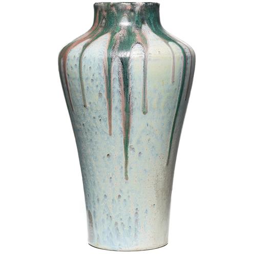 Big and decorative Greber vase, large form with flaring shoulder covered in a pink, green, brown and gray drip glaze, signed, 13.5"h
