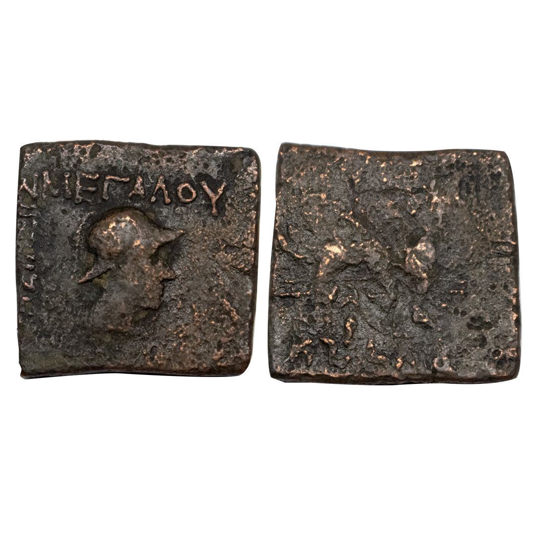 Greco- Bactria, Eukratides I, (170-145 BC,) Copper Unit, 8.60 gms, Obv. diademed and draped bust right, wearing crested helmet with bull's horn and ear, BAΣIΛEΩΣ / MEΓAΛOY / EYKPATIΔOY, Rev. the Dioskouroi on horses prancing right, each holding spear and palm, about fine, scarce.