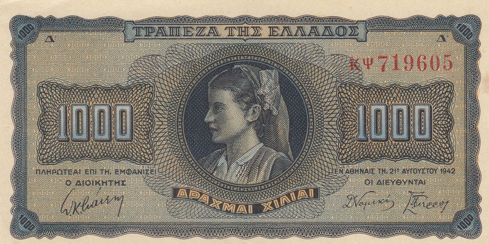 Greece, 1.000 Drachmai, 1942, UNC (-), p118br/serial number: 719605, There are counting fractures in