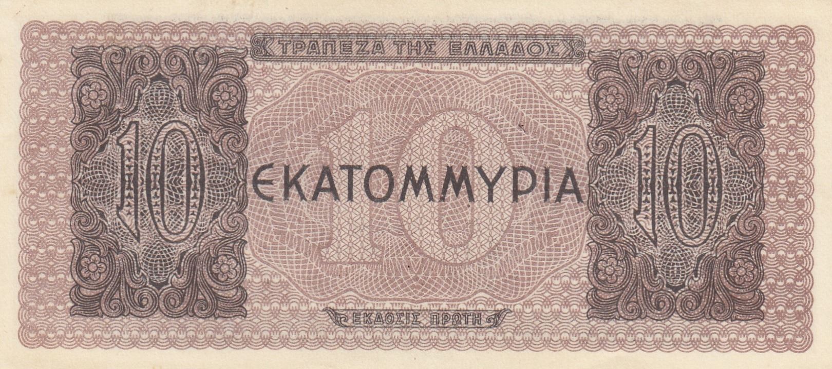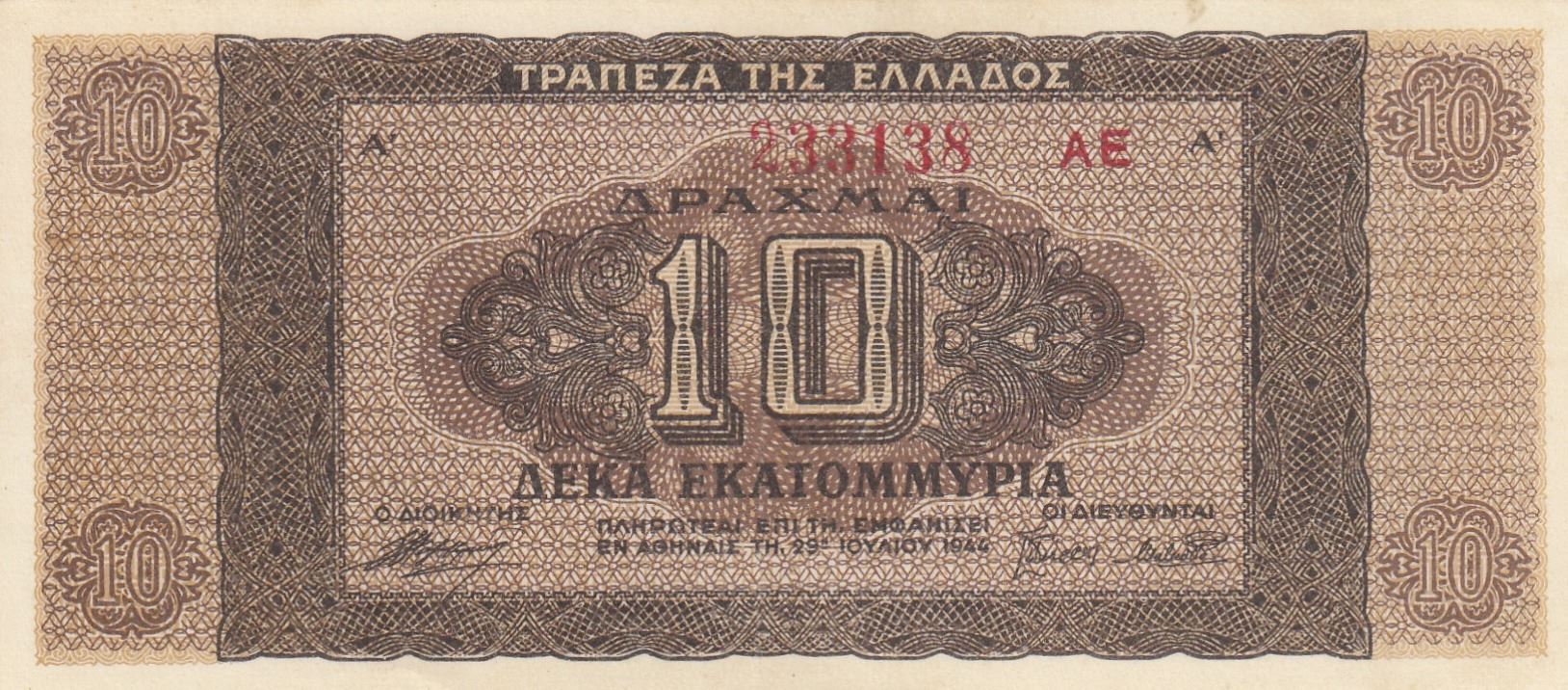 Greece, 10 Drachmai, 1944, AUNC, p127br/serial number: AE 233138