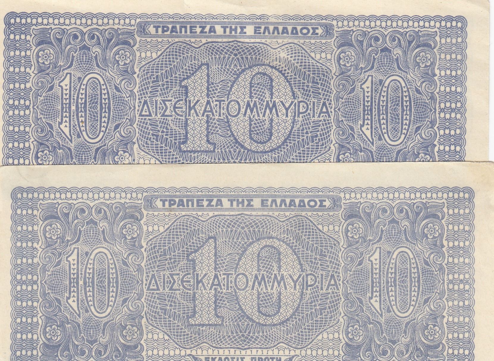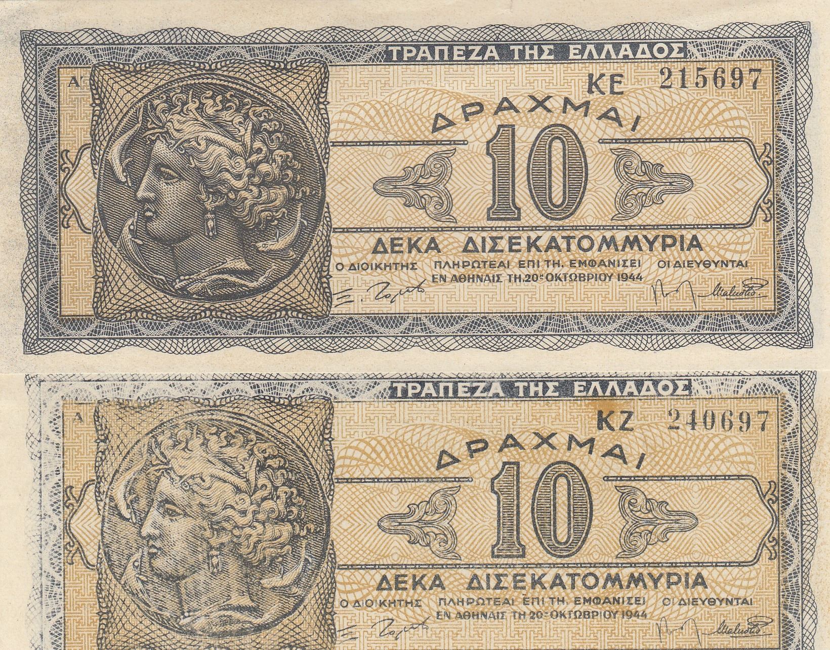 Greece, 10 Drachmai, 1944, UNC (-), p134b, (Total 2 banknotes)br/serial numbers: KE 215697 and KZ 240697, banknotes are not folded but there are multiple counting fractures