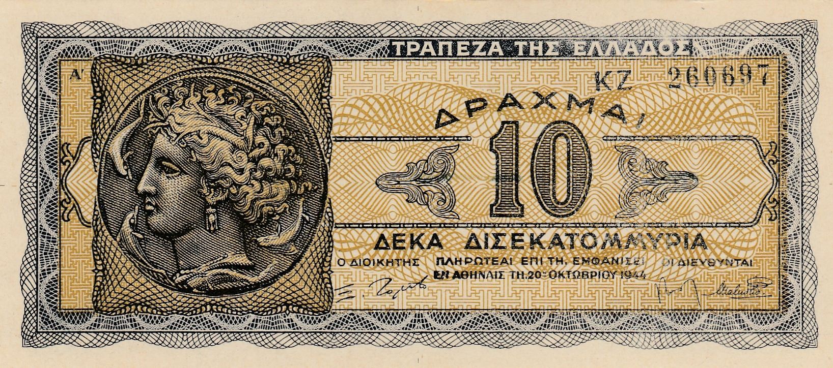 Greece, 10 Drachmai, 1944, UNC, p134bbr/serial number: 260697