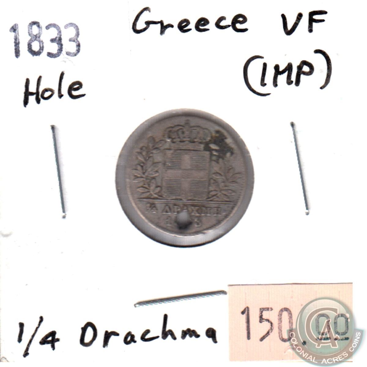 Greece 1833 1/4 Drachma in Very Fine (VF-20) Condition (impaired)