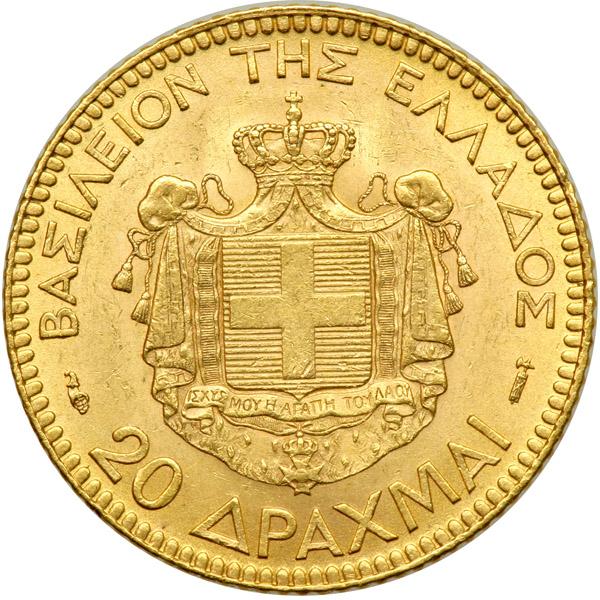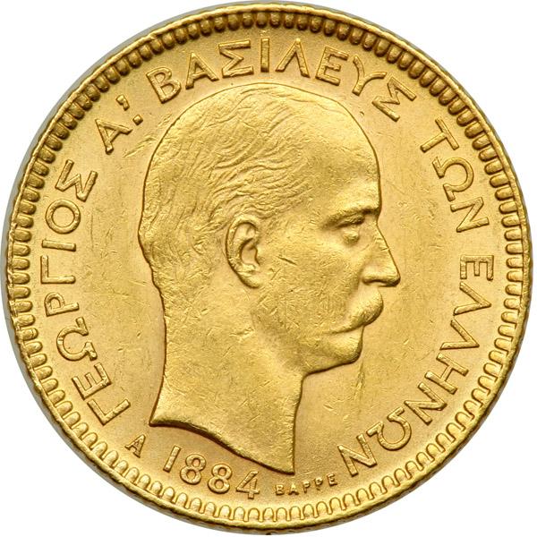 Greece. 20 Drachmai, 1884. Fr-18; KM-56. George I, 1863-1913. Old head right. Reverse: Arms. About Uncirculated.
