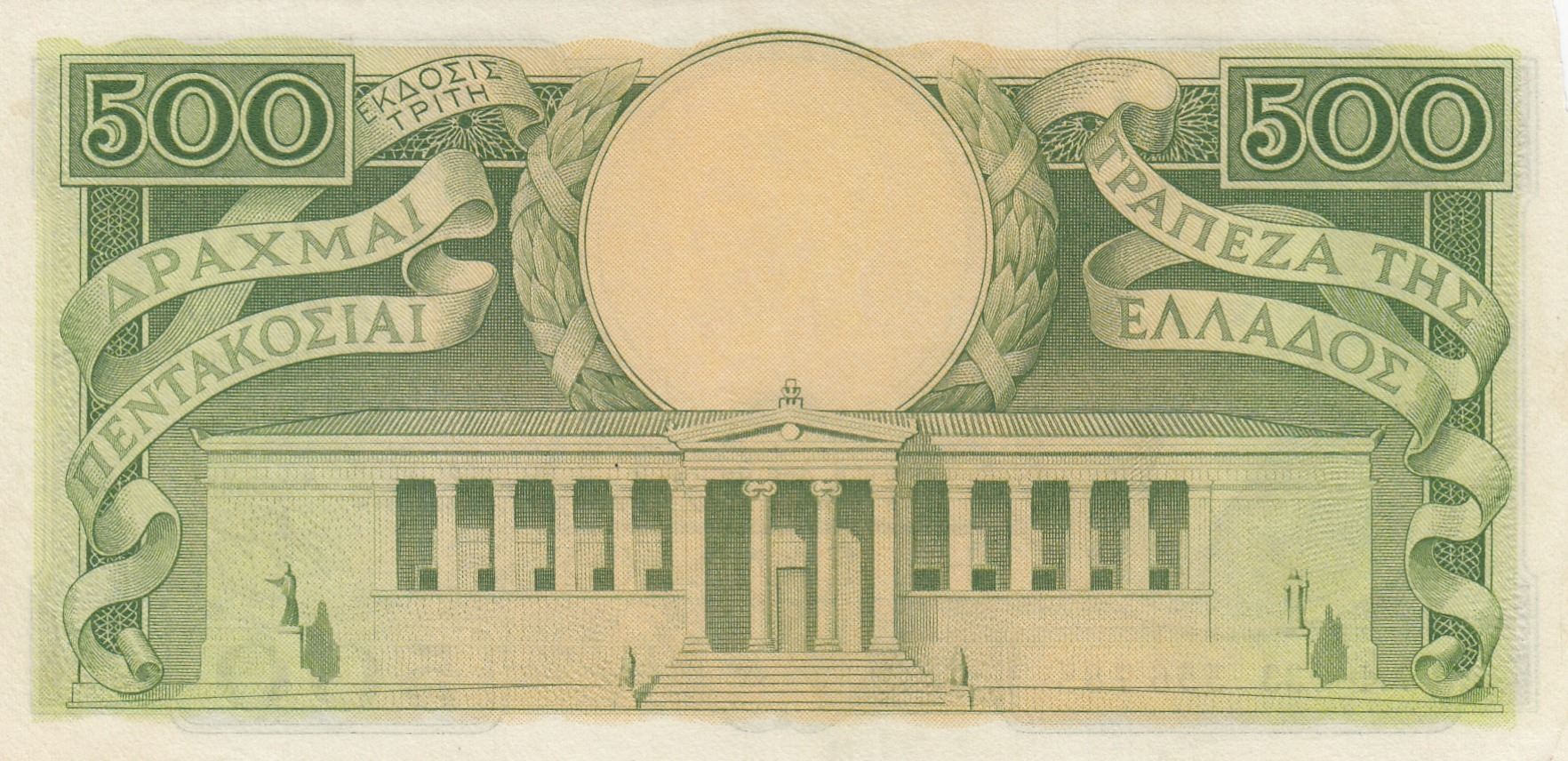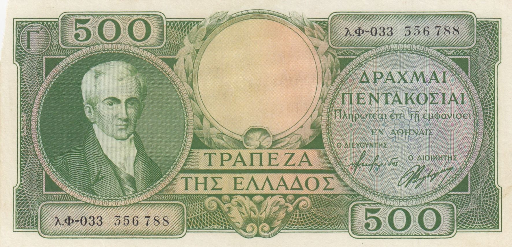 Greece, 500 Drachmai, 1945, UNC, p171br/serial number: 033 356788, As shown in the picture, there is a very small cut in the upper left frame.