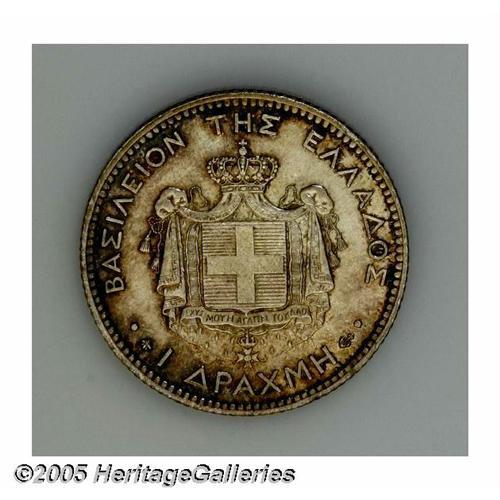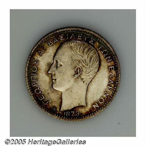 <B>George I Drachma 1873-A, </B></I>KM38, choice AU-UNC with delightful gray and purple patina over lustrous surfaces - just the slightest rub away from a mint state coin.