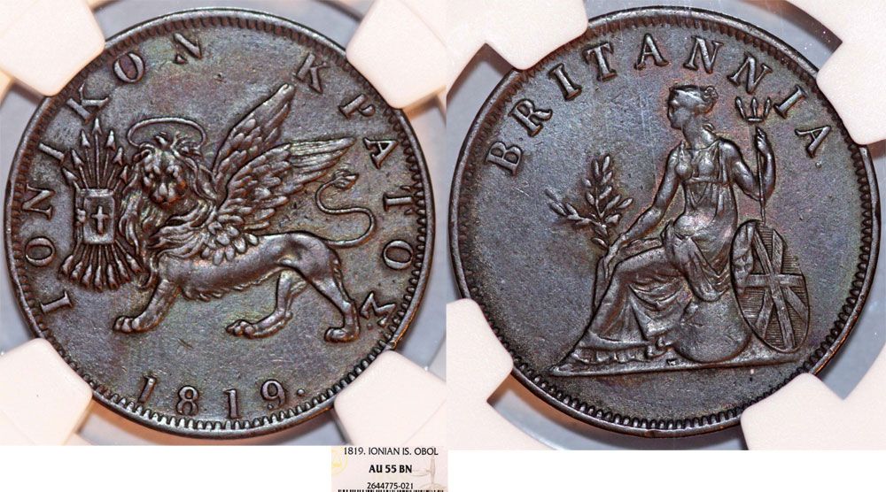 Rev: Britannia seated left on globe, holding olive branch and trident; Union shield to right.
