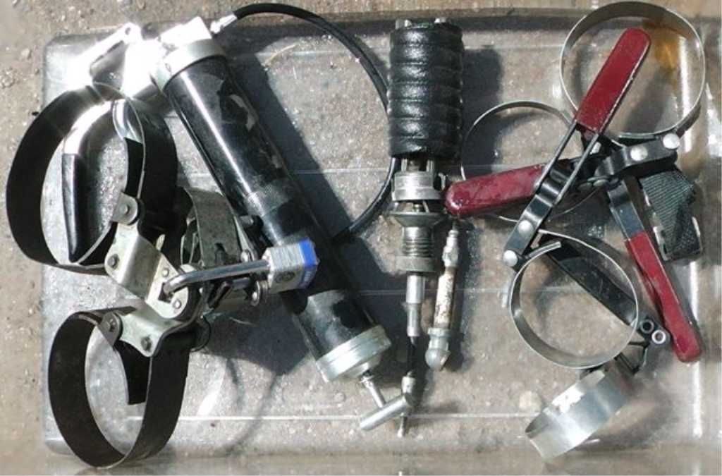 Greece Gun, 8 Oil Filter Wrenches, Cylinder Hone, Come-a-Long