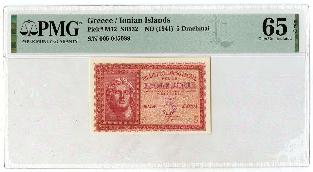 Greece - Ionian Islands, ND (1941). 5 Drachmai, P-M12, SB532, Issued Banknote, Red on orange underprint, Bust of Alexander the Great at left, S/N 005 045089, PMG graded Gem Uncirculated 65 EPQ.