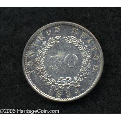 <B>Ionian Islands. British occupation 30 Lepta 1834 Dot, </B></I>KM35, choice UNC, lightly toned and fully lustrous.