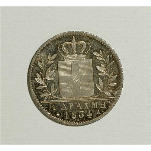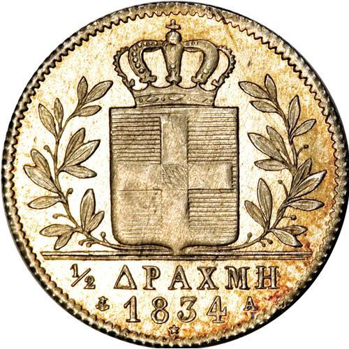 <B>Othon 1/2 Drachma 1834A, </B></I>KM19, superb prooflike UNC, flashy surfaces with beautiful russet and amber patina. Rare and highly desirable in this select quality.<BR><BR><b>Shipping:</b> Coins & Currency (<a target="_blank" href="http://www.heritageauctions.com/common/shipping.php">view shipping information</a>)