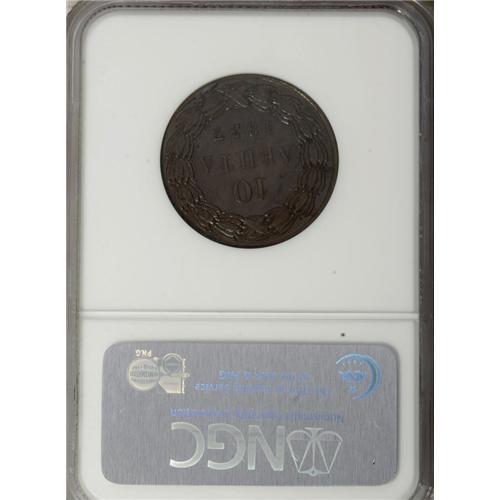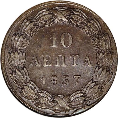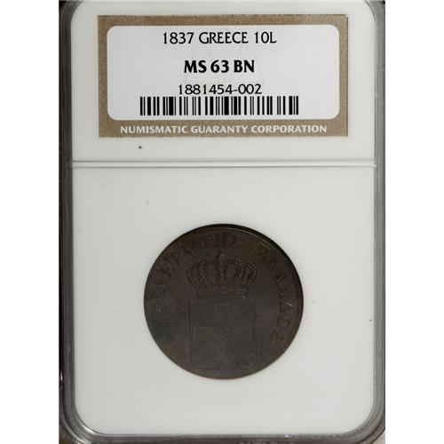 <B>Othon 10 Lepta 1837, </B></I>KM17, MS63 Brown NGC, very attractive with glossy brown surfaces and sharp details. Dates other than 1833 for this type are rarely encountered in mint state.<BR><BR><b>Shipping:</b> Coins & Currency (<a target="_blank" href="http://www.heritageauctions.com/common/shipping.php">view shipping information</a>)
