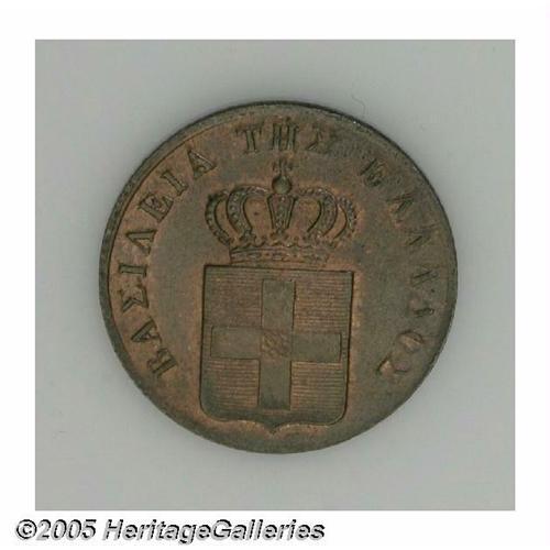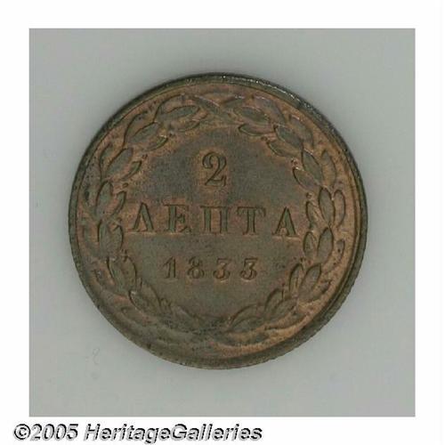 <B>Othon 2 Lepta 1833, </B></I>KM14, nice UNC, considerable mint luster. Very scarce grade.