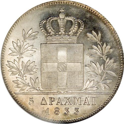 Greece: Othon 5 Drachmai 1833, KM20, MS66 NGC, a