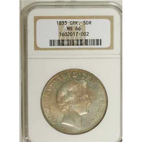 <B>Othon 5 Drachmai 1833, </B></I>KM20, MS66 NGC, a magnificent coin with incredibly sharp features, full mint brilliance and just a touch of light patina - a treasure for the ultra quality conscious collector.<BR><BR><b>Shipping:</b> Coins & Currency (<a target="_blank" href="http://www.heritageauctions.com/common/shipping.php">view shipping information</a>)