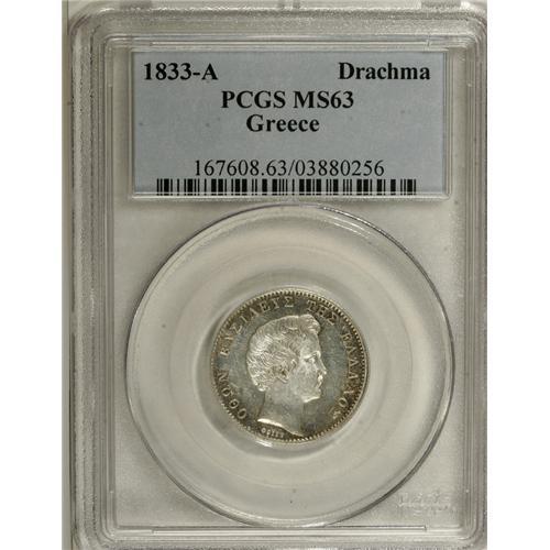 <B>Othon Drachma 1833A, </B></I>KM15, MS63 PCGS, fully lustrous with an exceptionally bold strike and attractive toning in the legends. The surfaces are slightly prooflike creating a cameo effect on the bust.<BR><BR><b>Shipping:</b> Coins & Currency (<a target="_blank" href="http://www.heritageauctions.com/common/shipping.php">view shipping information</a>)