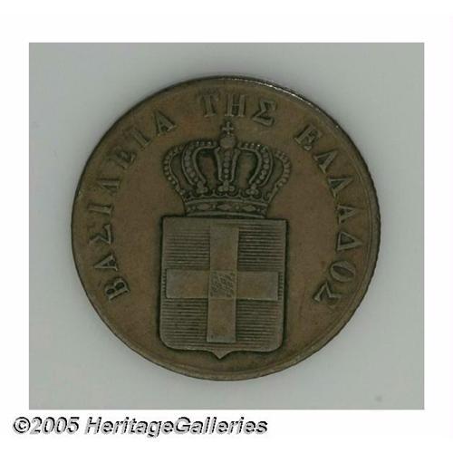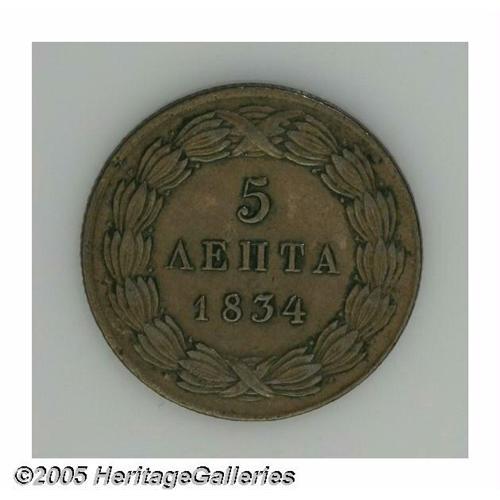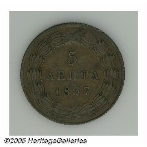 <B>Othon - Trio of 5 Lepta, </B></I>KM16, 1833, dark brown VF-XF, minor oxidation traces, 1834, choice VF+, very attractive and a scarce date, and 1837, VF, minor planchet flaws.