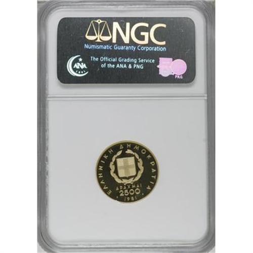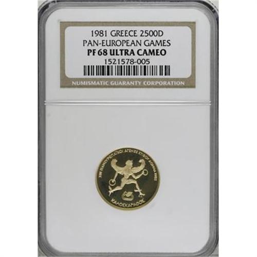 <B>Republic gold commemorative Pan-Euro Games 2500 Drachmai 1981,</B></I> KM-128, PR68 Ultra Cameo NGC, one of the presumably best survivors of the mintage of 75,000 pieces.<BR><BR><b>Shipping:</b> Coins & Currency (<a target="_blank" href="http://www.heritageauctions.com/common/shipping.php">view shipping information</a>)