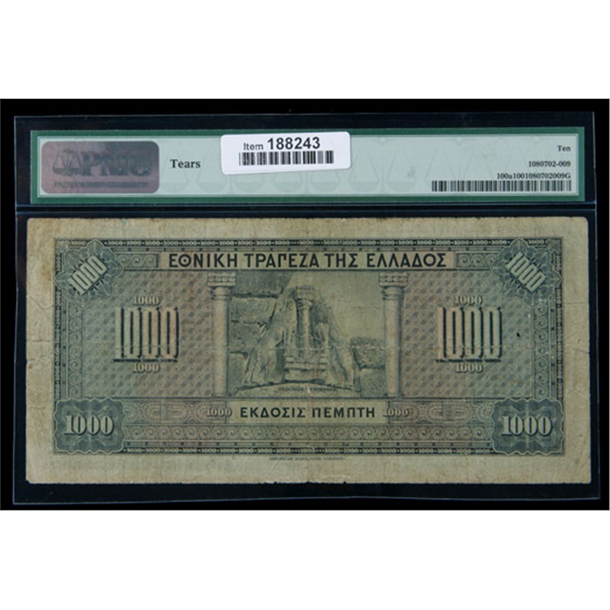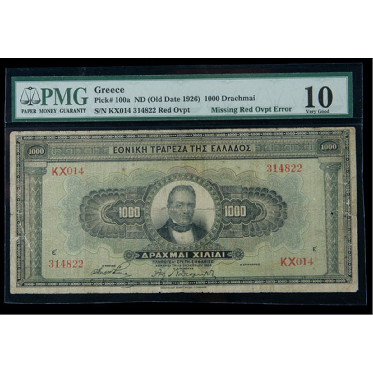 Greece SCWPM# 100a, ND (Old Date 1926) 1000 Drachmai. Missing Red Overprint. PMG Very Good 10. . Fr-P-100a. This note was classified as an error note, as missing the red overprint, by PMG. The holder has been trimmed, and the note can be removed. PMG also notes "tears."