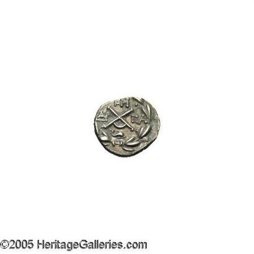 <B>Achaian League. Patrai.</B></I> Ca. 280 B.C. AR triobol (13 mm, 2.12 g). Laureate head of Zeus right / Monogram of the Achaian league; monograms to left and above, dolphin below. Clerk -; cf. SNG Copenhagen 254 (left monogram retrograde). Toned VF.