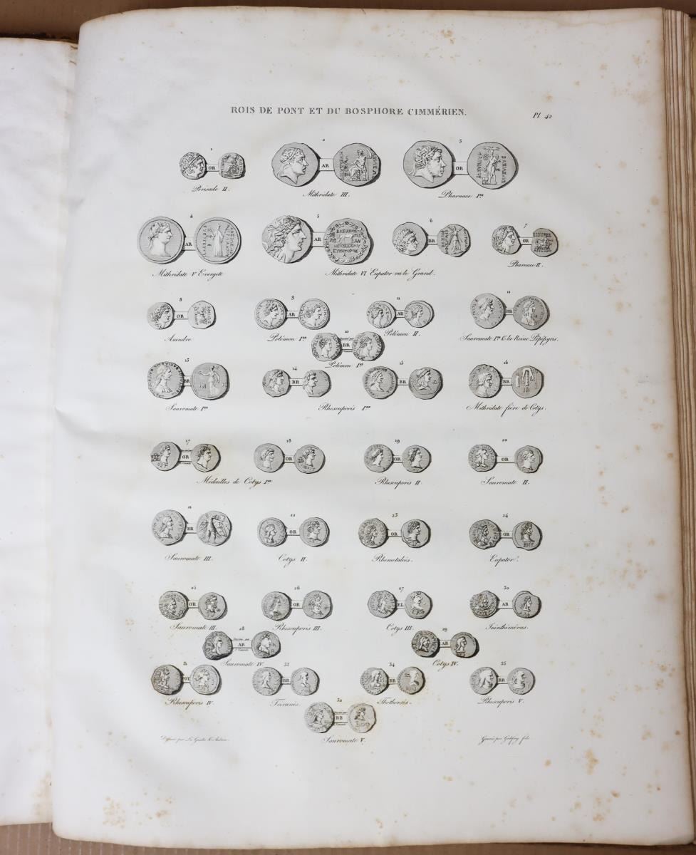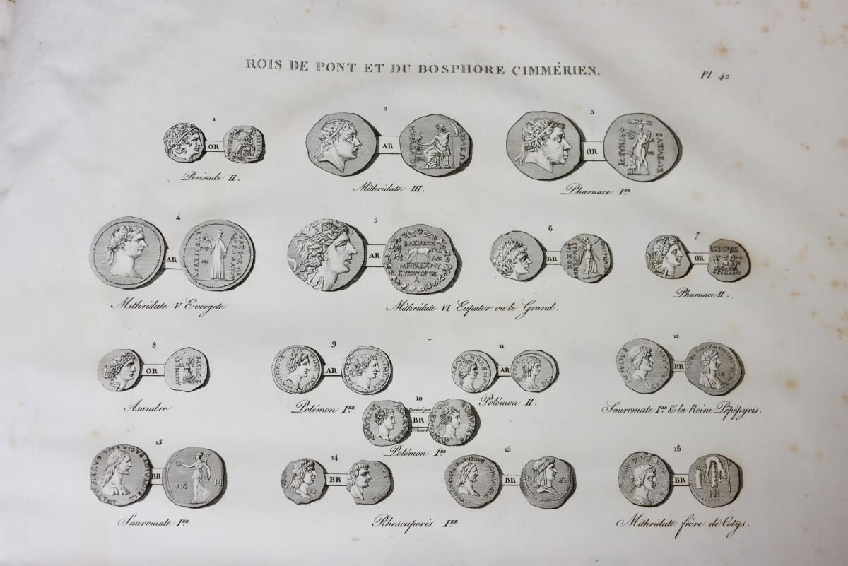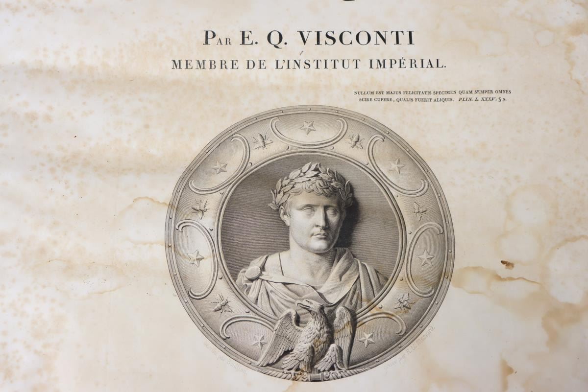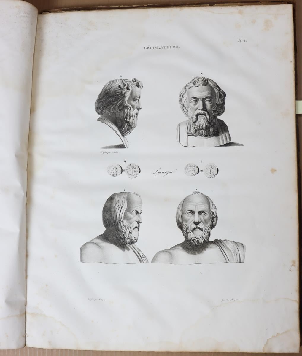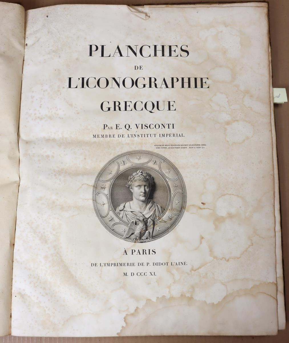 Important Greek book by E.Q. Visconti entitled "Planches De L'lconographie Grecque" (Greek Iconographic Plates), with busts and portraits of significant Greek figures and drawings of early Greek coins. Wear and water marks inside and the covers are seperated but still very rare and important.