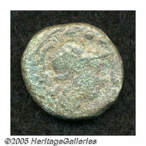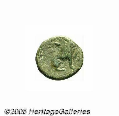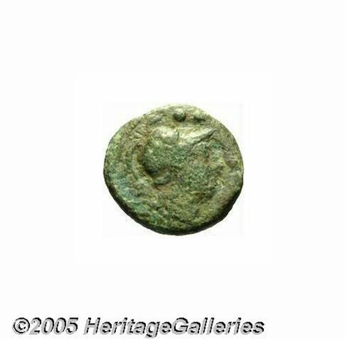 <B>Apulia, Mateola.</B></I> Ca. 250-217 B.C. Æ sextans (17 mm, 4.56 g). Helmeted head of Athena right; two pellets above / Lion seated right, breaking a spear held in its mouth. SNG ANS -; SNG Copenhagen 666. Fine, green patina. Very rare.