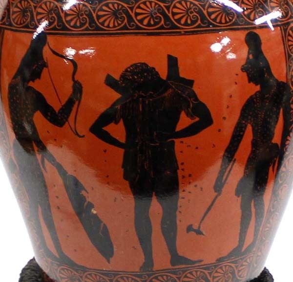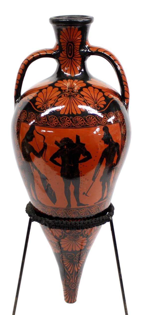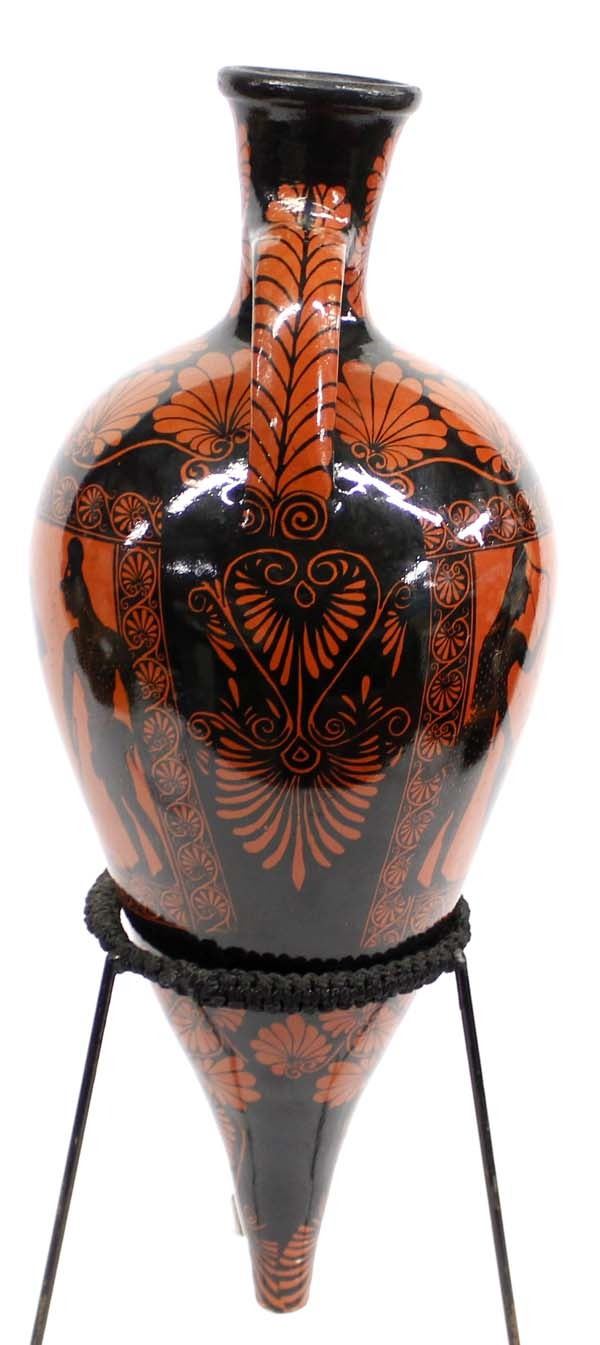 Greek Attic Black Figureware Rhyton Pottery Vase with Stand, measures 20'' x 8'', “these are vessels which fluids were intended to be drunk or to be poured in some ceremony such as libation, or merely at table”, beautiful piece
